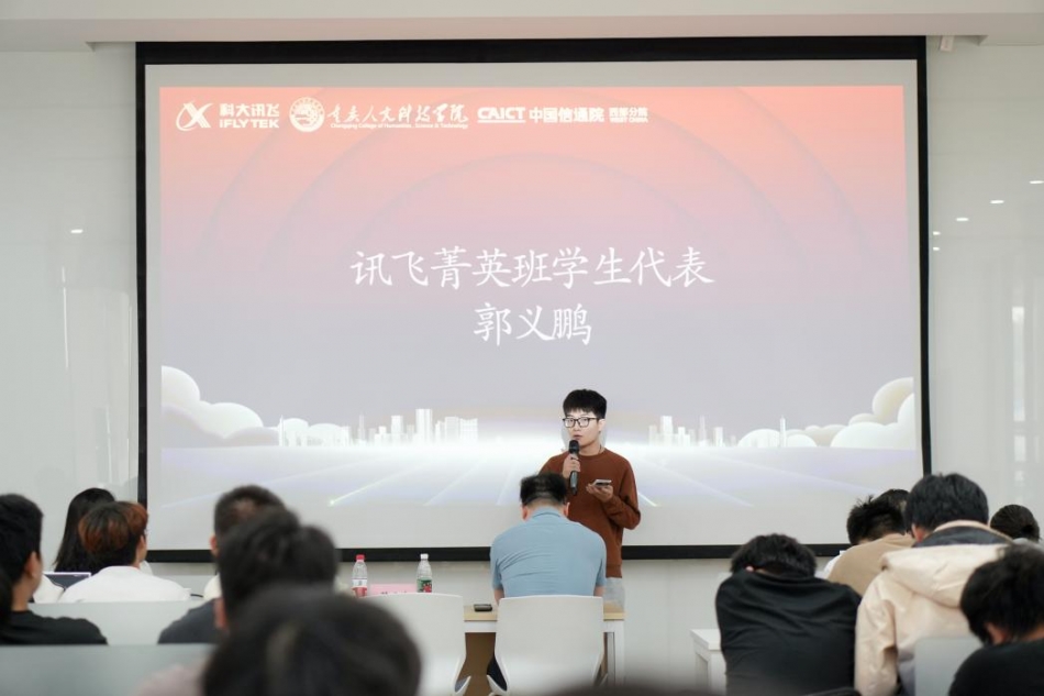 “讯飞菁英班”员工代表郭义鹏对公司和科大讯飞为同学们提供的学习和实践机会表示感谢。他表示,同学们定以勤勉不怠、积极进取的态度,不断充实自己,投入到学习和实践中,通过在实践中切身感受企业优秀的文化氛围,提升自身的专业技能和解决问题的能力。