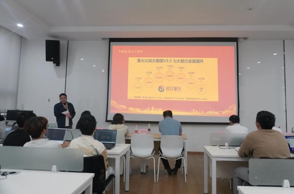 “讯飞菁英班”企业工程师张强详细介绍了员工培养计划,以培养员工企业级全栈开发能力为目标,借助科大讯飞人才呀学习平台和AIUI平台,将企业真实项目与实际作业场景引入教学,以短期集中式的学习与实战,提高员工动手实践与项目协作能力。实训结束经答辩考核,将对员工颁发"科大讯飞初级开发工程师"证书。他希望同学们明确发展目标,珍惜锻炼机会,积极参与实践实训,以企业员工的站位高标准要求自己,不断提高自身技能和职业道德素养。